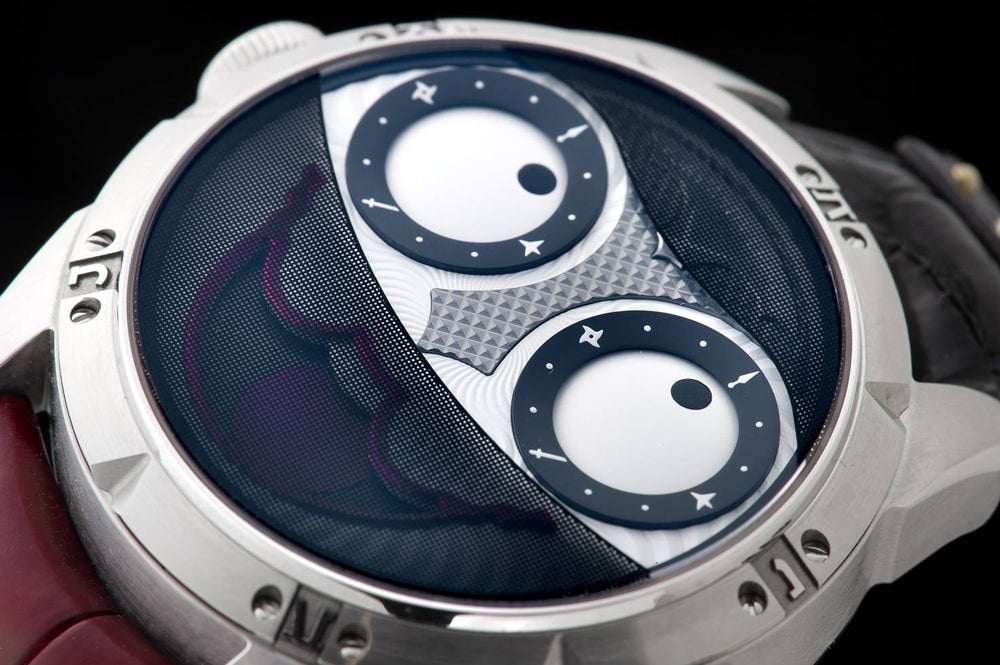 AHCIのメンバーで、独立時計師Konstantin Chaykin(コンスタンチン・チャイキン)が、日本限定モデルNINJAを発表しました。コンスタンチン・チャイキンは、独学で時計を学び、彼にしか表現できない世界を確立しました。同コレクションの特徴は、擬人化した目玉の動きで時・分を表示する、いわゆるレギュレーター時計であることです。彼はこれまで多くの複雑機構を手がけてきましたが、ここではあえてシンプルな機構を用いることで、着用者の感情を引き出すエモーショナルな現代アート風のデザインにしたいと考えました。新作での一番のこだわりは忍者のマスクです。これはサファイアガラスに特殊メッシュのプリントを施しています。また、ストラップの上下に施した忍者をモチーフにした装飾や日本刀をかたどったシルバー製プッシュピン、裏蓋の彫金デザインなどもこだわった部分です。