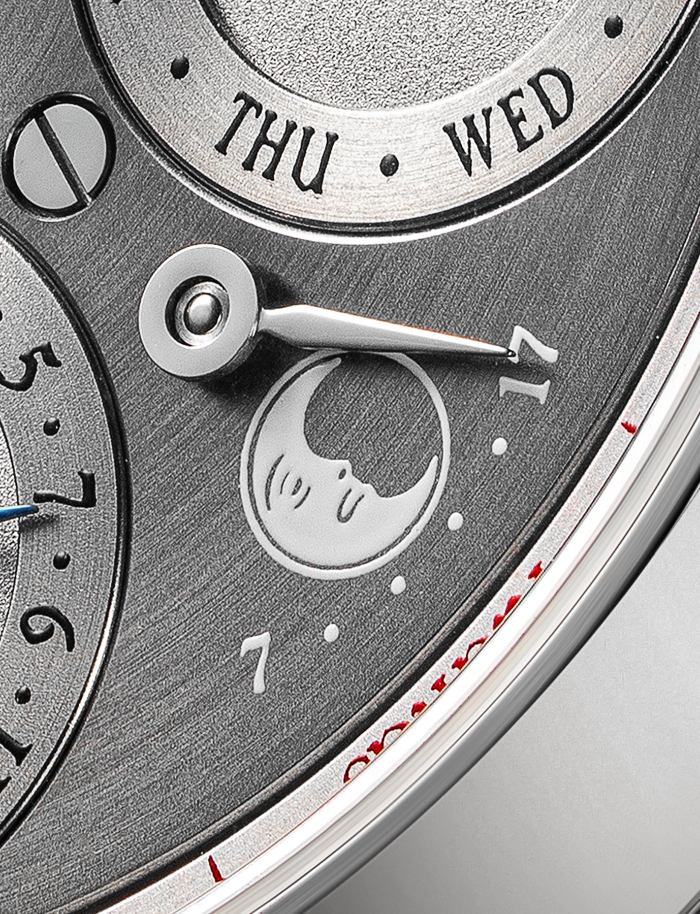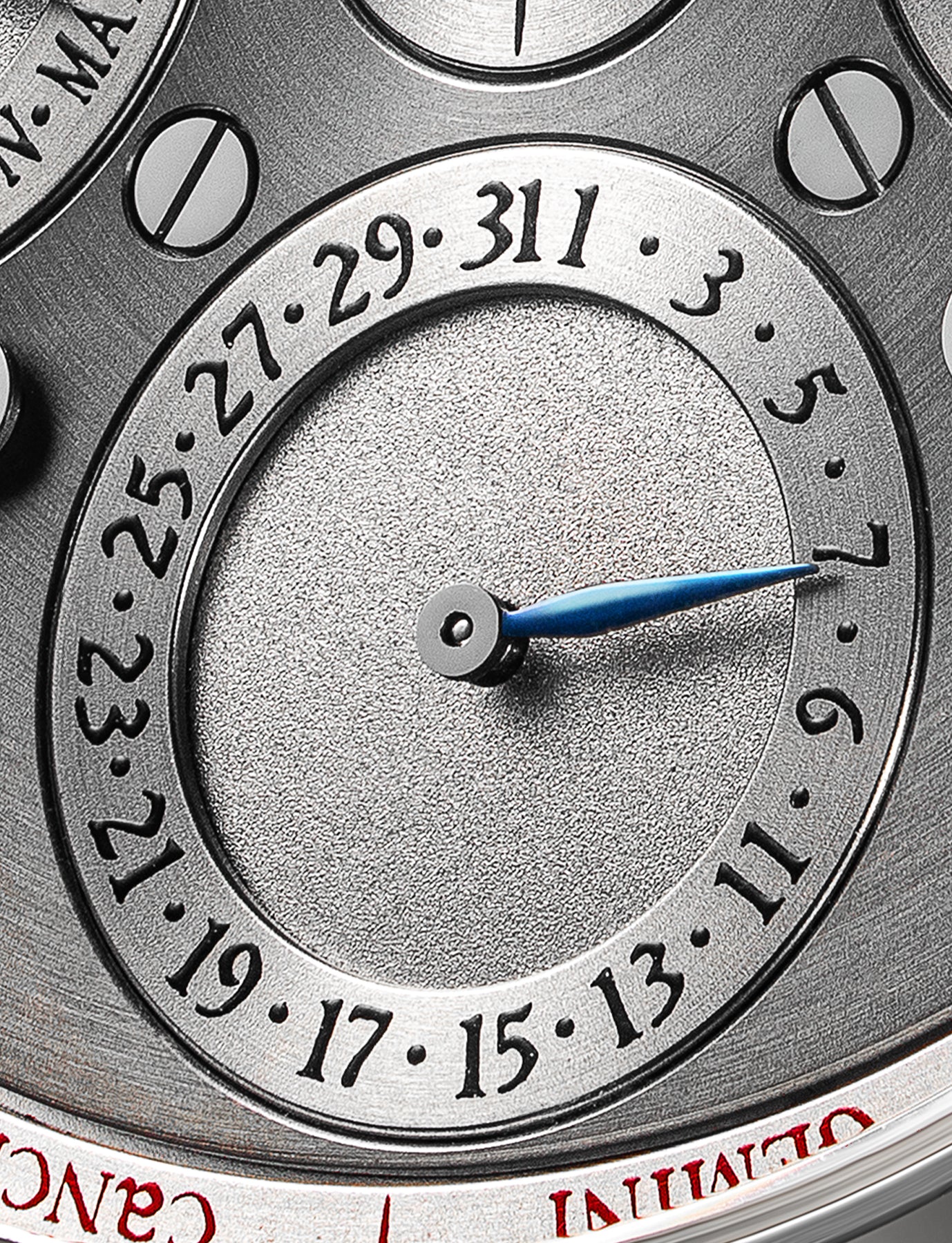 毎晩0時に永久カレンダーを前進させる日送り車が、一方向にしか回転しない設計。逆方向の回転が起こると破損の恐れがあります。